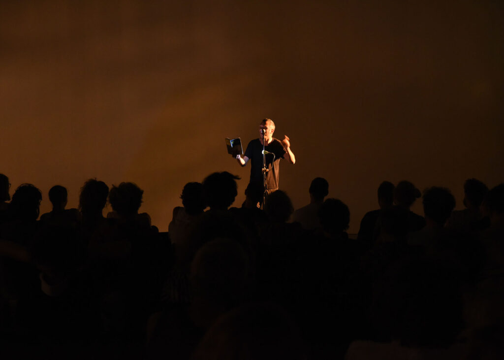La performance prend la forme d’une lecture « marchée » à la milieu de la publique à la sein d’une exposition.
